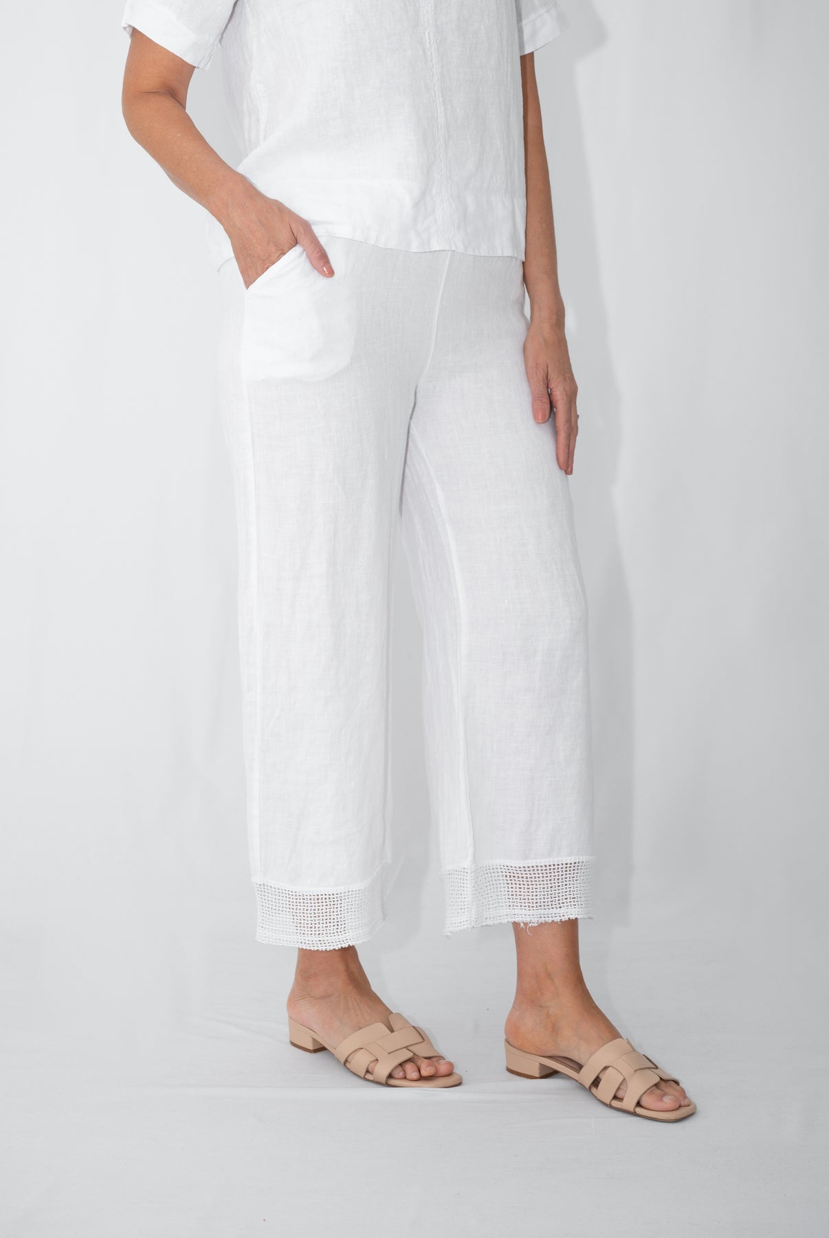 The Celeste Linen Pants are the kind of piece you build a summer wardrobe around. Light, breathable and softly structured, they sit effortlessly on the waist and fall into a relaxed wide leg that moves beautifully as you walk. The crochet hem adds a quiet point of interest, giving these an elevated edge while still feeling easy and wearable.