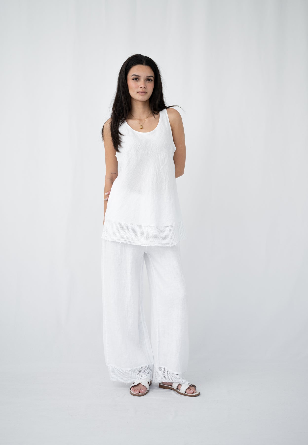 The crochet hem adds subtle detail and gives this simple shape a polished finish. Easy enough for everyday, but elevated enough to feel styled, it works just as well worn loose over linen pants as it does tucked into denim or tailored shorts. Pair it with the matching Celeste Linen Pants for a clean, cohesive summer set.