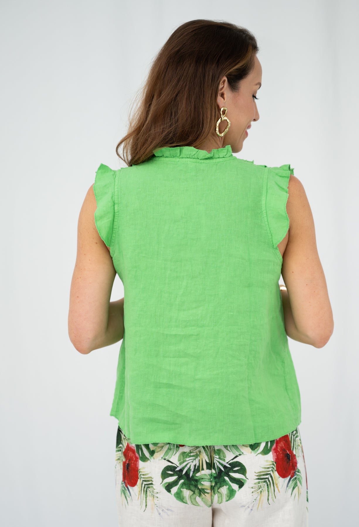 A fresh summer linen top with beautiful frill detailing that gives instant shape and softness. Made from premium Italian linen, the Isola Frill Top feels light, airy and perfect for warm Queensland days. The vertical frills create a flattering line through the body, while the button front and mini stand collar keep the look refined. It sits at a relaxed length, making it easy to pair with both printed and solid linen bottoms.