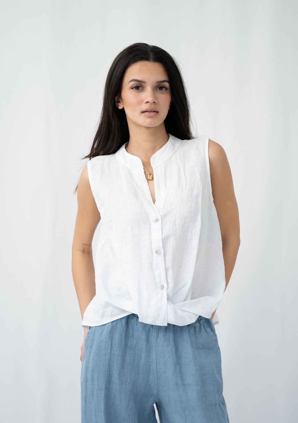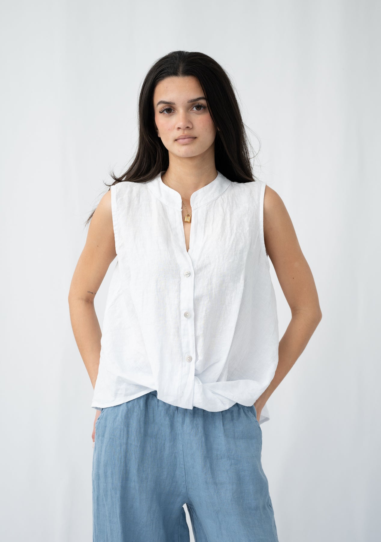 The Linen Easy Tuck Shirt in White is a timeless wardrobe staple made from 100% linen for natural breathability and easy elegance. Designed with a stand collar, button front, and curved hem, it offers a relaxed fit that tucks effortlessly for a polished finish. Lightweight, cool, and endlessly versatile — ideal for warm days and travel-ready dressing.