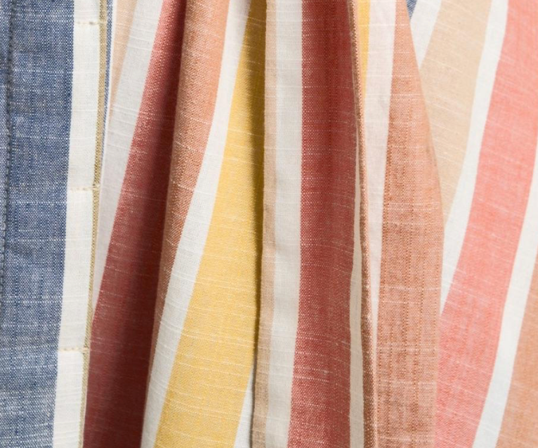 Woman wearing a pink sleeveless top and colorful striped shorts on a beige background